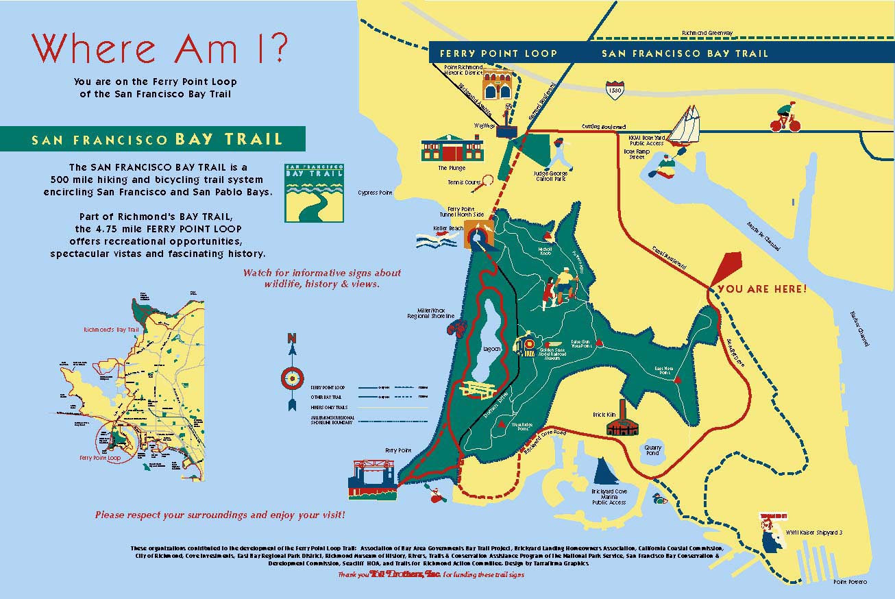 The Bay Trail now links all of Richmond’s southern shoreline parks — Point Isabel, Shimada, Marina Bay, Barbara & Jay Vincent, Lucretia Edwards and Miller/Knox Regional Shoreline where the 4.75-mile Ferry Point Loop has become a major recreational destination. If you're planning a visit to the area, you may want to download the high resolution map shown below, 250kb, or check here for information about planned outings. Check here for an interactive Eats & Treats map.